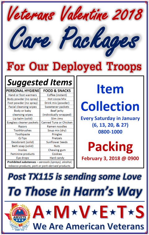 Military Care Packages January & February 2018 – Throughout January, veterans, family members, and friends contributed